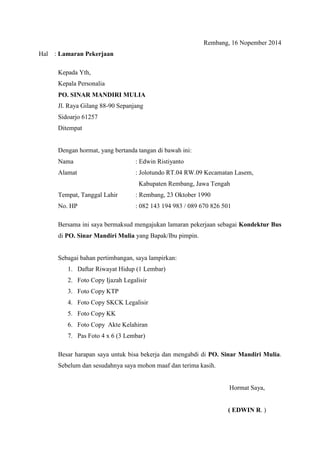 Loker Po Haryanto Lowongan Kerja Kernet Bus Akap Like And Share Haryanto Sangat Mengutamakan Pelanggan Dan Memberikan Pelayanan Yang Terbaik Atiannuc from lookaside.fbsbx.com Membuat surat lamaran pekerjaan terbaru 2021 yang baik dan benar merupakan hal yang wajib dilakukan oleh para pencari kerja. Contoh surat lamaran kerja profesional yang baik penting untuk anda perhatikan agar mendapat perhatian khusus bagi perusahaan tempat anda melamar. Apalagi bila anda sudah berkeluarga dan anda adalah seorang suami. Berikut adalah contoh surat lamaran kerja di pt, bank, guru, restoran, akuntan, dll. Surat lamaran merupakan surat permohonan yang dibuat oleh para pelamar pekerjaan atau pencari kerja, kemudian dikirimkan terhadap suatu. Diatas merupakan salah satu contoh dari surat lamaran kerja untuk di puskesmas. Sekian info contoh surat lamaran kerja dari saya, semoga bermanfaat, jangan lupa share ya! Dapat anda lihat bahwasanya di dalam contoh surat lamaran tersebut telah dicantumkan beberapa berkas berupa pas foto terbaru berlatar belakang merah 3 x 4 sejumlah 2 lembar, fotocopy ktp, fotocopy ijazah.